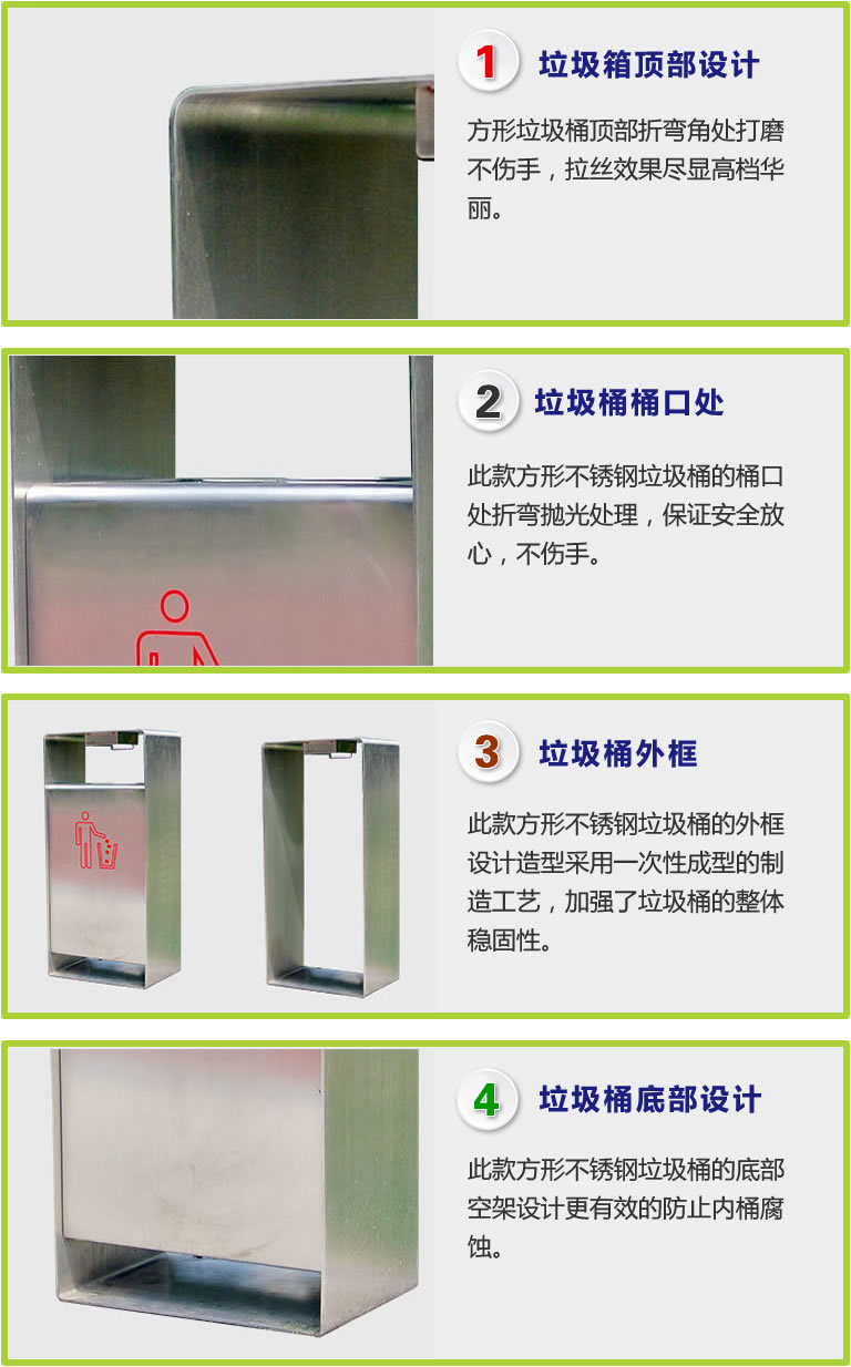 純不銹鋼色造型,不銹鋼垃圾桶側面開(kāi)門(mén)以保證不影響美觀(guān),也方便工人方便清理垃圾