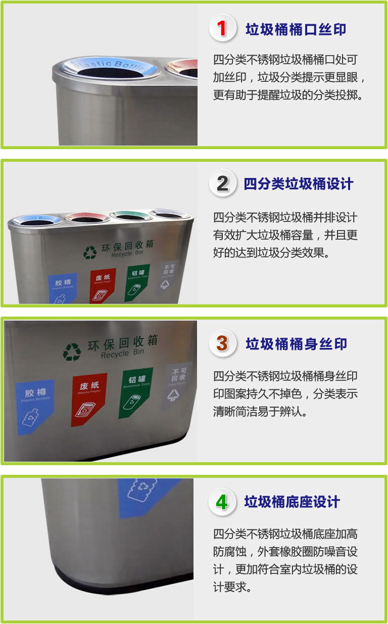 四分類(lèi)標識清晰明確,頂部斜度投口設計有助于丟垃圾時(shí)集中,不傷手