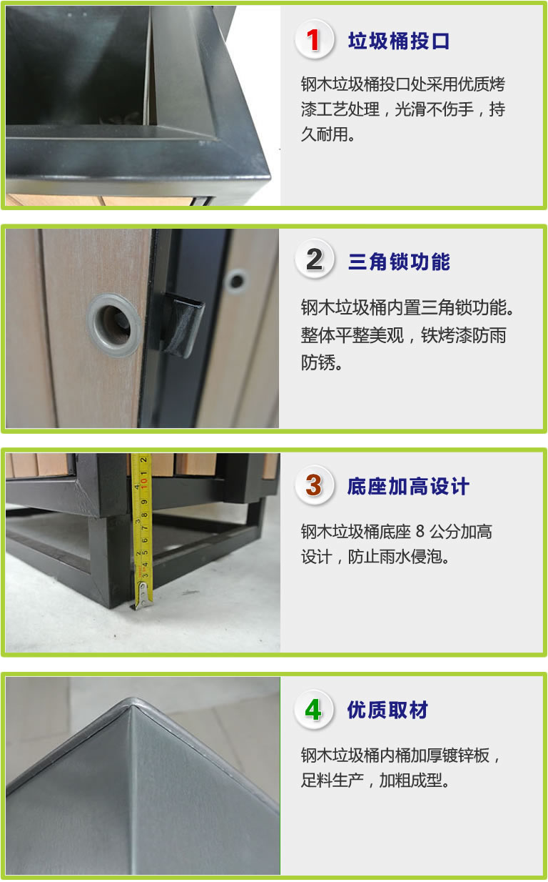 采用優(yōu)質(zhì)防腐PS防腐木配裝桶身,有效防水防蟲(chóng),耐用環(huán)保