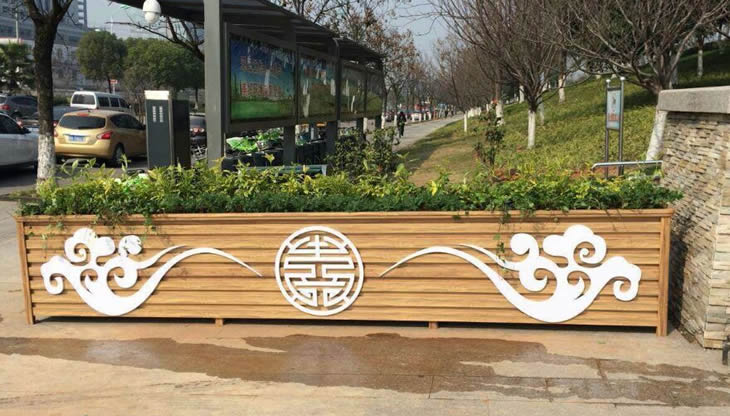 條形花箱采用了木紋鋁合金板材,其成品花箱堅固耐牢,不易受自然和人為因素影響而受損壞;ㄏ涞氖褂脡勖c防腐木花箱相比達到了10年以上不用更換;ㄏ浔砻嬖鷳B(tài)的木紋色與植被顏色形成詼諧的對比感,從花箱整體美觀(guān)度上提升不少觀(guān)賞性。